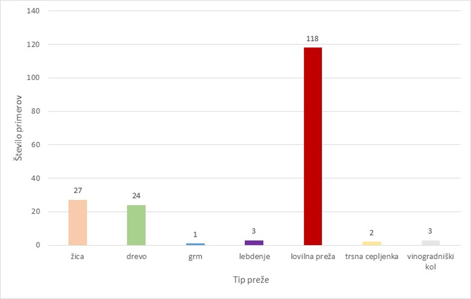 Slika 2: Izbor prež pri paru črnočelih srakoperjev, ki je v letu 2019 gnezdil na Ajdovskem polju (n=178 primerov)