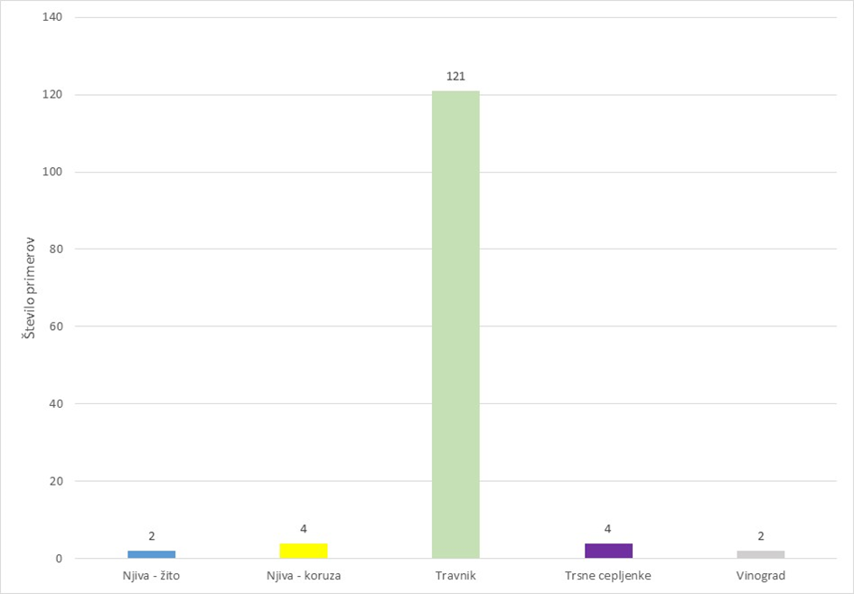 Slika 3: Prehranjevalne površine para črnočelih srakoperjev, ki je v letu 2019 gnezdil na Ajdovskem polju (n=133 primerov)