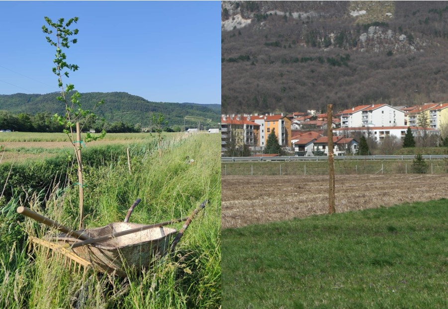 Posajena drevesa na Ajdovskem polju in ena od postavljenih prež. (Foto: Pia Höfferle, arhiv DOPPS)